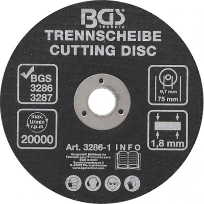 BGS 3286-1, Řezný kotouč | Ø 75 x 1,8 x 9,7 mm BGS Technické specifikace: - max. otáčky pohonu 20 000 ot/min - vhodné pro BGS 3286 a 3287 - průměr: 75 mm - průměr otvoru: 9,7...