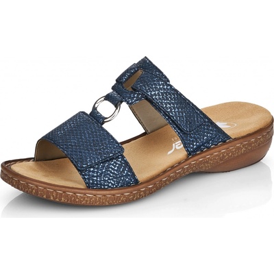 Dámské pantofle značky Rieker 62936-14 s modrým vzorem zdobené ozdobou na pásku. Díky páskům na suchý zip jsou snadno nastavitelné. Vyměkčené stélky si zamilujete....