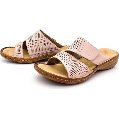Dámské kožené pantofle s dvěma perforovanými pásky, pásek přes nárt je opatřen suchým zipem na zapínání. Stélka je látková, velmi příjemně vyměkčena. - výška podpatku 3,5 cm...