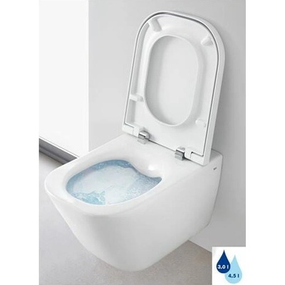 WC závěsné s hlubokým splachováním, bez splachovacího okruhu, který je označován jako Rimless. Toto WC závěsné je navíc s povrchovou úpravou Maxi Clean.