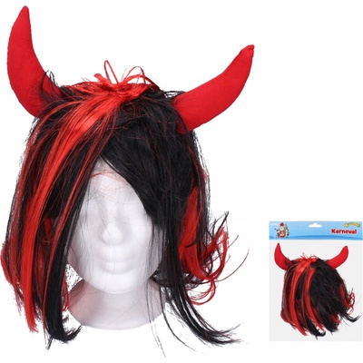 Černo-červená paruka pro čerty a čertice s červenými rohy a dominantní červenou barvou vlasů, mezi nimiž se ukrývají také černé čertovské vlasy. Baleno v sáčku. Karneval...