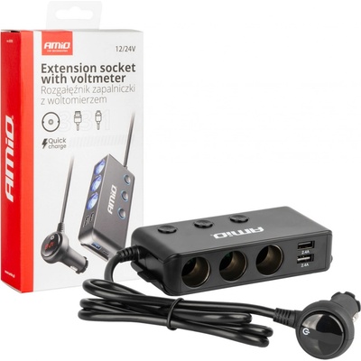 Prodlužovací zásuvka zapalovače AMIO s QC 3.0, 3 zásuvkami 12-24V, 2× USB-A QC 3.0. Tato prodlužovací zásuvka zapalovače s vestavěným digitálním displejem a technologií QC 3.0 umožní pohodlné a rychlé nabíjení více zařízení současně. Nabízí tři zásuvky 12/24 V pro...