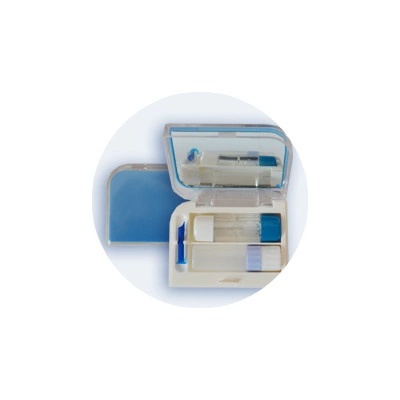 Pouzdro na tvrdé čočky - sestava - obsahuje plastové pouzdro na tvrdé kontaktní čočky, aplikátor, zrcátko a nádobkou na roztok. Tvrdé kontaktní čočky vložte mezi "packy" úchytů...