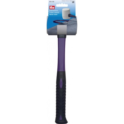 Lehké gumové kladívko Prym (250 g) s ergonomickou fialovou rukojetí a gumovou hlavou Ø 4,5 cm. Ideální na upevnění patentek, nýtů, oček a spon bez poškození textilu či kovu.
