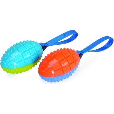 Aportovací rugby míč s textilními poutky. Velikost 22 x 11 cm.