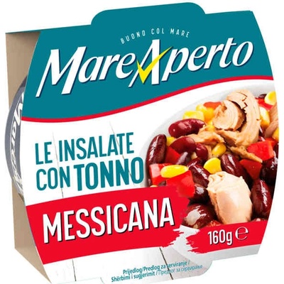 Tuňákový salát Messicana Mare Aperto 160g Dokonalá kombinace lahodného tuňáka, červených fazolí, kukuřice, zeleniny a slunečnicového oleje Vám umožní vychutnat si rychlý oběd...