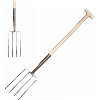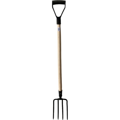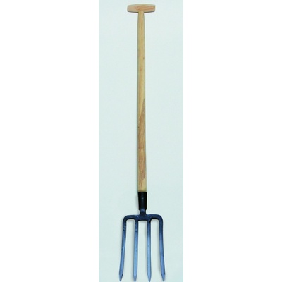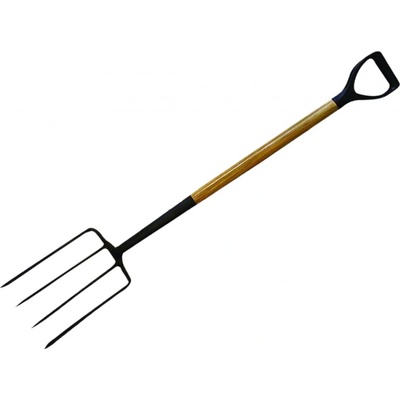 Kované rycí vidle mají pevné hroty na rozrušení tvrdé a kamenité půdy. Násada je dřevěná, rukojeť do tvaru T. Barva: černá.