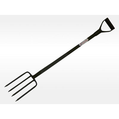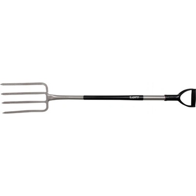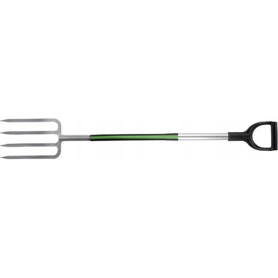 Rycí vidle z tvrzené uhlíkové oceli. Ocelová násada má protiskluzový gumový potah, je zakončena dvoukomponentní rukojetí.