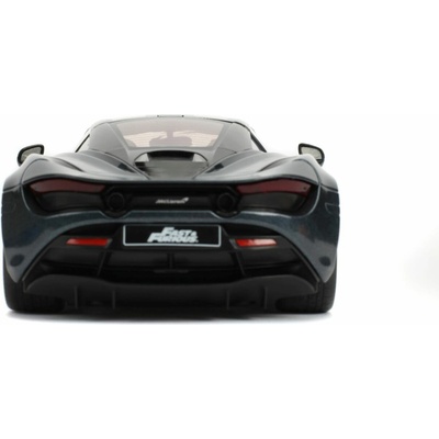 Kovový model auta Shawa McLaren 720S v měřítku 1:24 z filmu Rychle a zběsile. Na volnoběh, otevírací dveře, kufr a kapota. Velikost 20,5 cm. Dovozce do EU Dickie Spielzeug...
