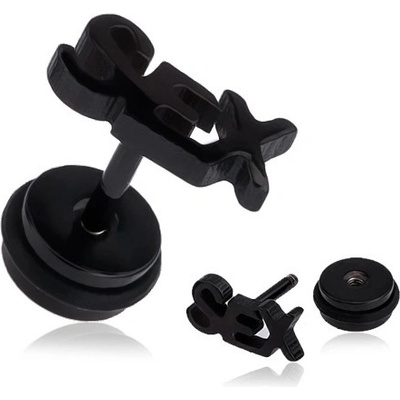 Černý falešný piercing do ucha "SEX", PVD úprava povrchu, gumička černé barvy.