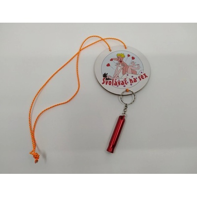 Dřevěná medaile na krk s píšťalkou - Svolávač na sex. Krásný dárek pro partnera nebo partnerku k narozeninám i Vánocům. Průměr medaile je 10 cm.