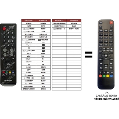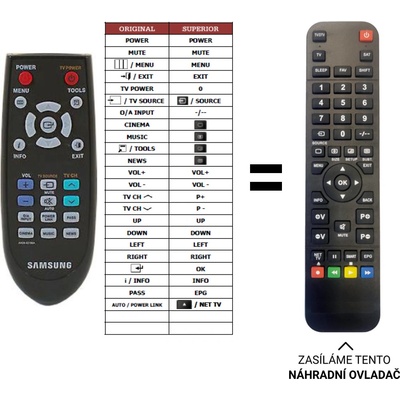 BEZ ZADÁVÁNÍ KÓDŮ. Náhradní dálkový ovladač má všechny funkce jako originál. Pro LCD TV Plazma a Monitory Samsung. Rozpis tlačítek je přiložen. Například pro PS42C430A1WXXH,...