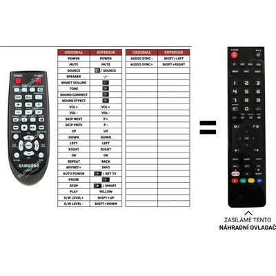 Náhradní dálkový ovladač jiného vzhledu BEZ NUTNOSTI ZADÁVAT KÓDY pro domácí kina samsung HW-F450, HW-FM45, HW-FM45C, nahrazuje také AH59-02612B pro HW-H550, HW-H551