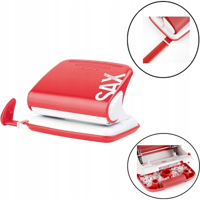 Nová děrovačka inovovaného designu vhodná do kanceláří i domácnosti Možno zkombinovat se stejněbarevnou sešívačkou SAX Design Integrovaný posuvný příložník Kapacita 20 listů Rozteč 80 mm Výška děrovaného sloupce 2 mm Průměr děrovaného otvoru 5,5 mm