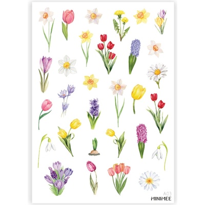Krásné vyřezávané samolepky v aršíku A5 s motivy jarního kvítí - tulipány, narcisky, sněženky, krokusy, aj. Kvalitní bílá samolepka matného, přírodního vzhledu. Vyrobeno v Česku.