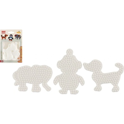Pomůcka pro vytváření obrázků ze zažehlovacích korálků. Sada bílých plastových podložek obsahuje slona, tučňáka a pejska. Vhodné od 5 let.