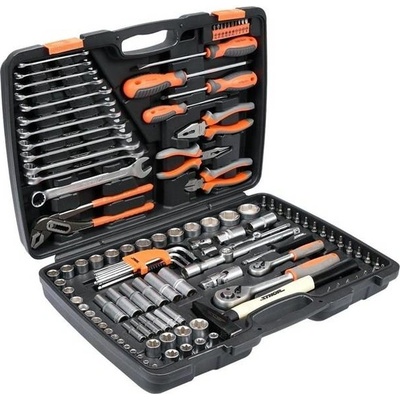 komplexní sada gola nářadí, 122 dílů z nástrojové oceli, ráčny 1/2" a 1/4", systém as-drive, přenosný kufřík Sada nářadí gola 1/2", 1/4" Sthor122 kusů Komplexní sada gola nářadí s ráčnami 1/2" a 1/4" pro široké spektrum mechanických prací. Sada nabízí 122 dílů...