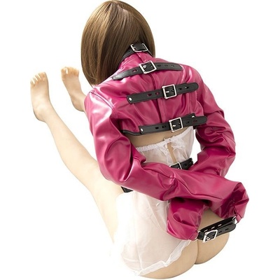 Laková svěrací kazajka s poutacími řemeny okolo rukou, v pase a přes rozkrok. Zapínání vzadu na zip. Materiál: LAK (57 % polyuretan, 43 % polyamid).