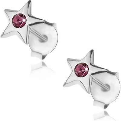 Puzetové náušnice ze stříbra 925, lesklá pěticípá hvězda se vsazeným Swarovského krystalkem tmavě fialové barvy.