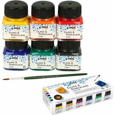 Sada barvy na sklo a porcelán KREUL clear Sada obsahuje: 6 x barva na sklo a porcelán KREUL clear 20 ml – sluneční žlutá, oranžová, královská červená, tmavě modrá, tmavě zelená, espresso hnědá 1 x štětec Transparentní barva na sklo a porcelánová se vzhledem...