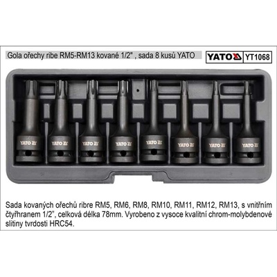 Sada bitů Yato 1/2 Ribe - YT-1068 8 ks Sada obsahuje kalené zástrčné klíče - gola ořechy Ribe 1/2", velikost RM5 - RM13, materiál z chrom-molybdenové oceli, tvrdost materiálu HRC 54. Charakteristika: Tepelně zušlechtěno na HRC 54 Materiál: z kvalitní CrMo (Chrom...