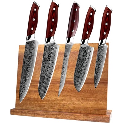 Prémiová sada nožů SaKuRo Red Pakka do každé kuchyně. 67 vrstev damaškové oceli, tvrdost až HRC 60±2 a jako dárek ZDARMA magnetický stojan z akáciového dřeva.
