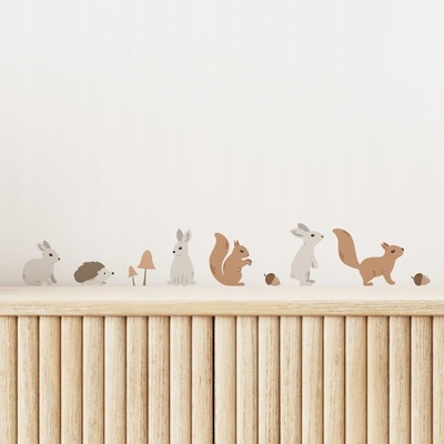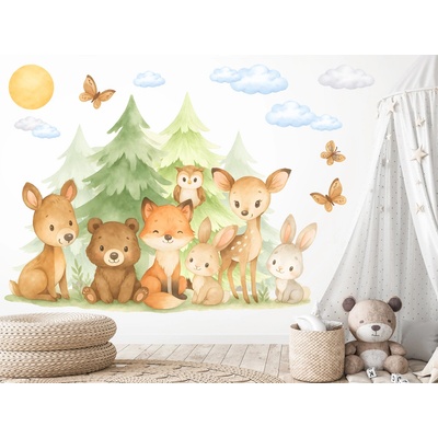 Samolepka na zeď Zvířátka u lesa promění dětský pokoj v kouzelné a klidné místo plné přírody, pohody a přátelství. Roztomilá lesní zvířátka – lištička, medvídek, srnka, zajíčci...