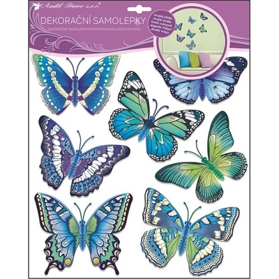Dekorační samolepky na zeď s modrými motýli. Zkrášlete si svůj domov příjemnými motivy na zdi či okně. Snadné použití doma nebo na chalupě. Vhodné na stěny, okna, zrcadla,...