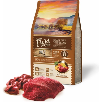 Sam's Field Grain Free Venison. Superprémiové krmivo s nulovým obsahem obilovin a s vysokým obsahem masa z vysoké zvěře 24 % a krůty 22 %. Kompletní krmivo pro dospělé psy všech velikostí a plemen. Prvotřídní komplexní výživa Sam's Field respektuje přirozené nutriční...