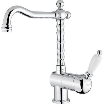 Dřezová stojánková baterie s retro hubicí ramínko baterie je otočné chromové tělo, bílá keramická páčka připojení k přívodu vody 3/8" Vodovodní baterie Kirké se svým designem...