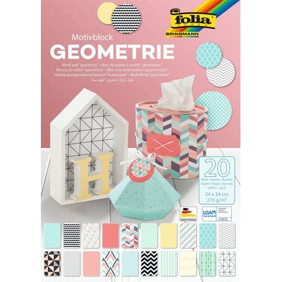 Nádherné designové papíry v bloku. 20 listů fotokartonu s geometrickými motivy. Rubová strana je bílá. Balení: 20 listů ve 20 motivech rozměr: 24 x 34 cm gramáž: 270 g/m2.