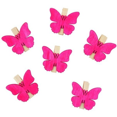 Růžoví dřevění motýlci. Díky kolíčku se dají všestranně použít, například krásně ozdobí jarní věnce.