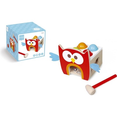 Se zatloukací hračkou si děti užijí spoustu legrace. Součástí hračky je malé dřevěné kladívko a čtyři barevné koule. Děti dřevěným kladívkem zatlučou kouli do dírky u a ta pak putuje skrz sovičku, kde za odměnu zazvoní na rolničku.Pestrobarevná zatloukací hračka...