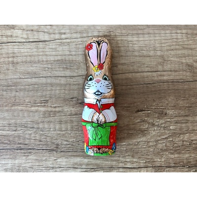 Dutá figurka z mléčné čokolády ve tvaru zajíčka. Složení: cukr, sušené plnotučné mléko, kakaové máslo, kakaová hmota, laktóza, emulgátor (sójový lecitin). Obsah kakaové sušiny...