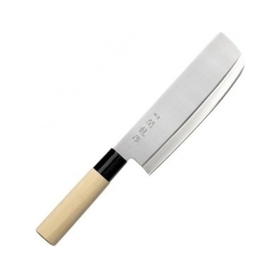 Tradiční kuchyňský japonský nůž Nakiri, ideální na krájení a sekání zeleniny, ovoce i masa. Délka čepele: 170 mm Celková délka: 300 mm Material čepele: 420j Rukojeť: dřevo Honoki
