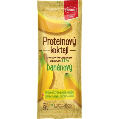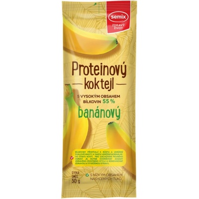 Semix Proteinový koktejl banánový 30 g. Připravte si chutný koktejl s vysokým obsahem bílkovin, které přispívají k růstu a udržení svalové hmoty a také k udržení normálního stavu kostí – při vyšším příjmu bílkovin ze stravy dochází k nižšímu slábnutí kostí při...