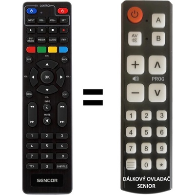 Náhradní dálkový ovladač Sencor DVBT 1005T - SDB 1008T bez nutnosti nastavování. Po vložení baterii funguje jako originál. Rozpis tlačítek přiložen