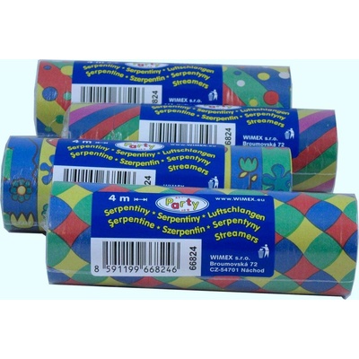 Papírové serpentiny pruhované, délka 4 m, dodávané po 18 ks ve fólii. Parametry - Délka: 4 m - 18 jednotlivých ks - Barva: barevné - Značka: Wimex
