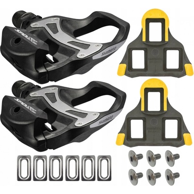 Silniční pedály Shimano SPD-SL, včetně kufrů / zarážek SM-SH11.Lehké kompozitní těloMimořádně velký terčík pro snadnější záběrExtra široká platforma pro maximálně efektivní přenos sílyOdolná deska těla z nerezové oceli snižuje ohyb a opotřebení těla pedáluŠiroké...