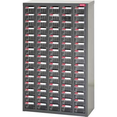 Galvanizovaný pořadač montážního materiálu a nářadí s celkem 75 průhlednými plastovými zásuvkami, každá o rozměrech (Š x V x H) 90 x 55 x 218 mm.