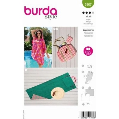 Střih Burda zelený 5807 - plážové pončo, skládací podložka, plážová taška, taštička je soubor střihů pro ušití plážových doplňků. Střihy jsou natištěné na kvalitním křídovém papíru. Soubor obsahuje střihy pro ušití plážových doplňků a dámského ponča. Díky střihu...