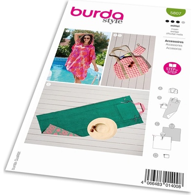 Střih Burda zelený 5807 - plážové pončo, skládací podložka, plážová taška, taštička je soubor střihů pro ušití plážových doplňků. Střihy jsou natištěné na kvalitním křídovém...