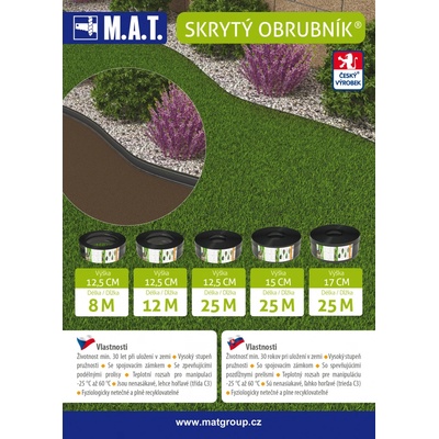 Vysoce flexibilní skrytý obrubník slouží k rychlému řešení, jak od sebe oddělit různé plochy na zahradě. Splňuje vysoké normy pro mechanickou pevnost, rázovou pevnost a tahové vlastnosti. Zaručuje životnost minimálně 30 let při uložení v zemi.