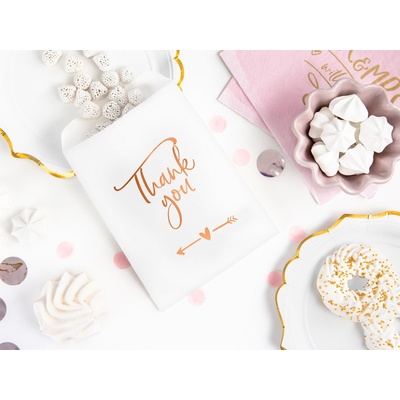 Papírový sáček s růžovozlatým nápisem Thank you. Sáček je vhodný na popcorn, želé, svatební mandle a na další sladkosti. Sáček lze použít i na svatební rýži. Pytlíček je...