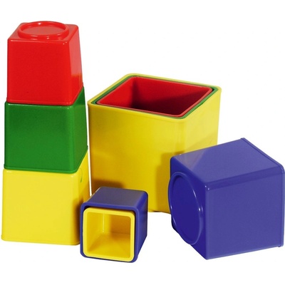 Devět barevných plastových kostek pro nejmenší podporuje rozvoj jemné motoriky, logického myšlení a koordinace oko–ruka. Duté kostky lze skládat do věže i vkládat do sebe, největší má 9 × 9 × 9 cm. Vhodné od 1 roku, vyrobeno v ČR. Barevné provedení je v mixu barev dle...