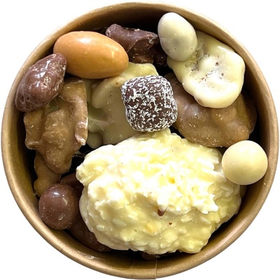 Co byste měli vědět: Druh: Směs dražovaných skořápkových plodů a sušeného ovoce Složení: Cukr, ARAŠÍDY, kakaové máslo, rozinky, prášek z plnotučného MLÉKA, kakaová hmota, KEŠU...