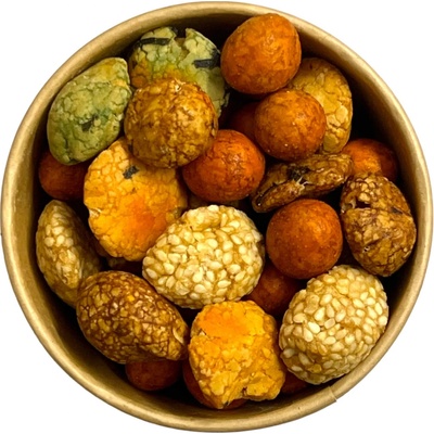 Složení: Arašídy, rýžová mouka, cukr, pšeničná mouka, sezam, bramborový škrob, sojová omáčka, ságo škrob, dextrin, mořské řasy, cibulový prášek, česnekový prášek, zvýrazňovač...