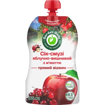 Jablečno-třešňový džus-smoothie s dužinou 185ml Garden Gadz Přírodní džus-smoothie Garden Gadz „Jablko–třešeň“ — hustý nápoj z 100 % ovocného pyré bez přidaného cukru, vody a...