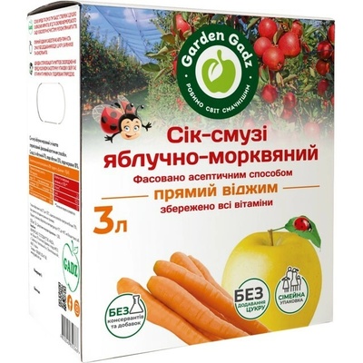 Jablečno-mrkvová šťáva-smoothie 3l Garden Gadz Šťávy Garden Gadz jsou vyráběny s láskou z vlastního ovoce, bobulí a zeleniny z farmářské zahrady v ekologicky čistém regionu...