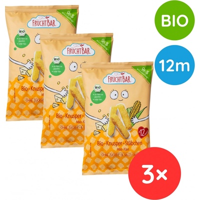 FruchtBar BIO kukuřičné křupky se sýrem nesolené 3× 30 g Kukuřičné křupky se sýrem, nesolené a v BIO kvalitě vhodné od ukončeného 12. měsíce. Bez přidaného cukru, bezlepkové....